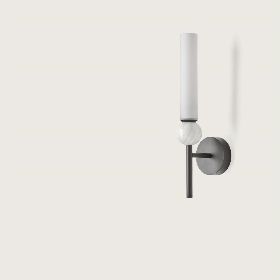 Este aplique de pared es la combinación perfecta de materiales nobles y diseño elegante. Su estructura en acero se complementa con detalles en mármol y una tulipa de vidrio opal, creando una pieza de iluminación sofisticada y atemporal.