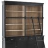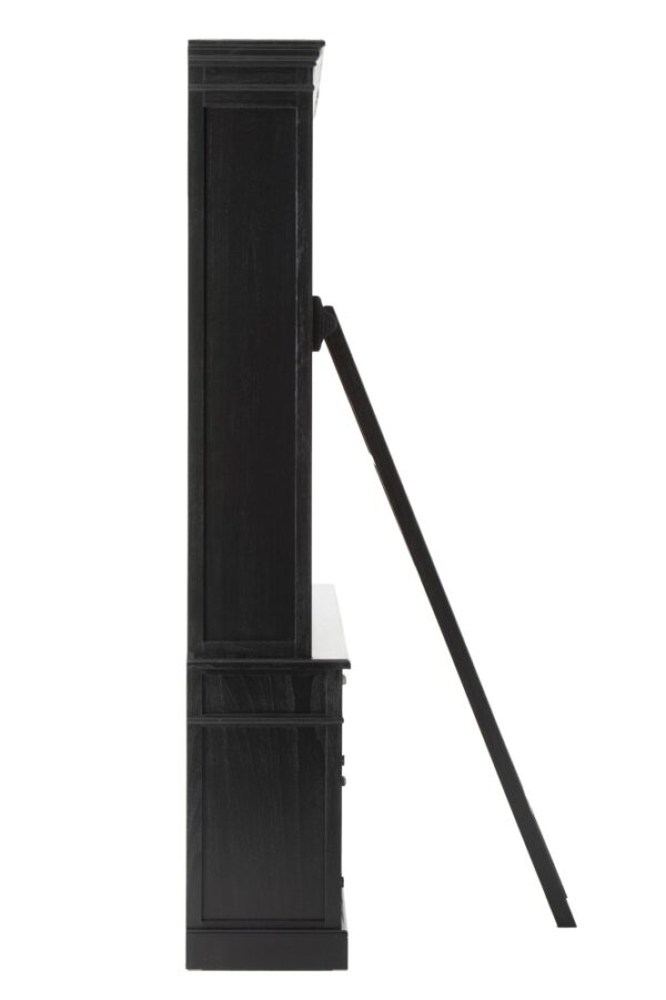 - Librería fabricada de manera artesanal en madera de abeto con un acabado negro y natural en su interior, está dividida en dos piezas, con estantes en la parte superior, cajones y puertas con estante interior en la inferior, cuenta con una barra de latón que sirve de soporte a la escalera.