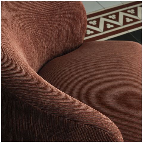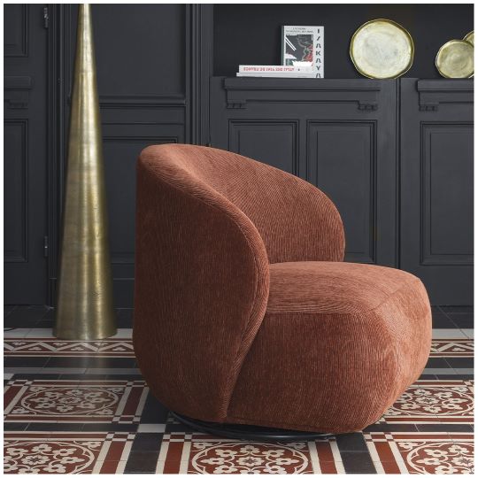 Esta butaca es una pieza de diseño que combina sofisticación y confort en un formato compacto y acogedor. Tapizada en un exquisito terciopelo acanalado de color terracota, su textura aporta profundidad visual y una sensación agradable al tacto. Su respaldo envolvente y su asiento generoso invitan al descanso, convirtiéndola en la elección ideal tanto para espacios de lectura como para salones modernos. La base giratoria permite libertad de movimiento, mientras que su diseño redondeado y sin aristas duras transmite una estética fluida, contemporánea y elegante. Perfecta para quienes buscan una pieza versátil que combine estilo y funcionalidad, esta butaca es un acento ideal para ambientes con carácter.