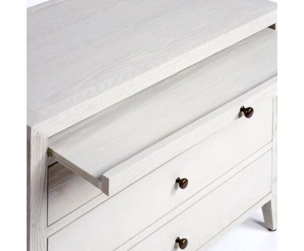 Esta cómoda de roble con acabado blanco grisáceo patinado combina un diseño minimalista y refinado, ideal para aportar luminosidad y calidez a cualquier espacio. Su estructura limpia y elegante, junto con el sutil patinado, resalta las delicadas vetas naturales de la madera, proporcionando un efecto visual sereno y sofisticado. Equipada con tres amplios cajones, ofrece un almacenamiento funcional y ordenado para ropa, textiles o accesorios. Los tiradores metálicos en tono bronce aportan un detalle moderno que equilibra su estética clásica y contemporánea. Perfecta para dormitorios, salones o recibidores, esta pieza se adapta a estilos escandinavos, modernos o shabby chic, convirtiéndose en un mueble versátil que combina practicidad y elegancia en cualquier ambiente.