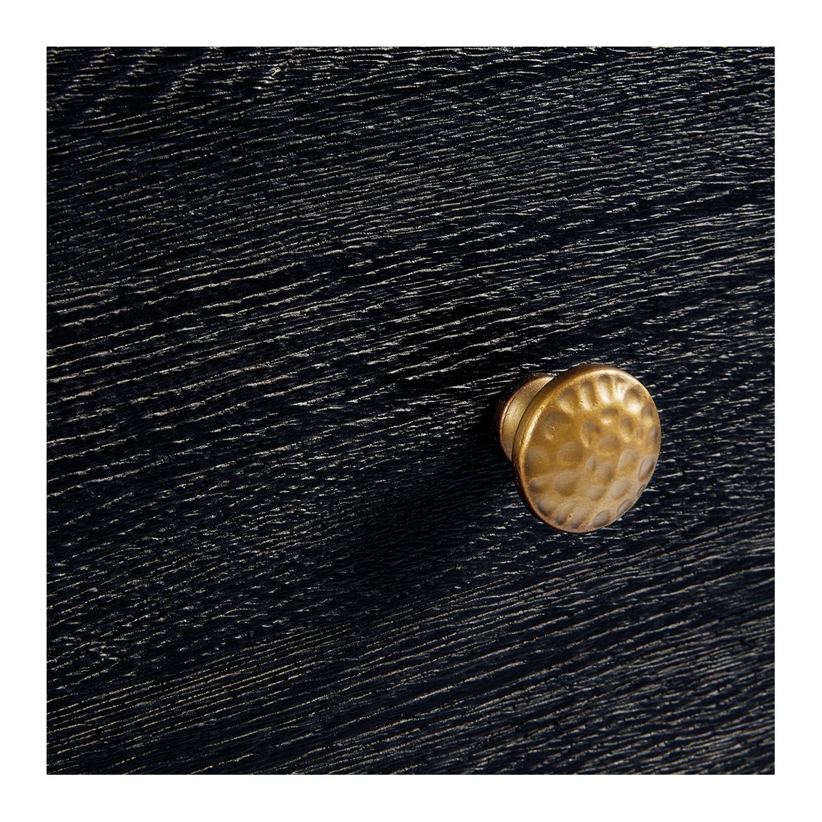 La Cómoda Negra de Roble con Tiradores Dorados es una pieza de mobiliario que combina elegancia y funcionalidad en un diseño sobrio y contemporáneo. Fabricada en madera de roble macizo, su acabado en negro mate resalta la veta natural de la madera, aportando profundidad y textura visual. Su diseño destaca por la ligera curvatura del frente y las líneas limpias que aportan un aire sofisticado y moderno. Los dos amplios cajones permiten almacenar ropa, textiles o accesorios del hogar con total comodidad. Los tiradores redondos en tono dorado envejecido añaden un contraste visual atractivo y refinado, mientras que los pies con detalle metálico en la base refuerzan su carácter distintivo. Esta cómoda es ideal tanto para dormitorios como para espacios de paso o salones que requieran un toque de distinción y orden.