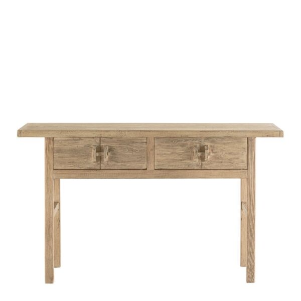 La consola de madera de olmo reciclado con 2 cajones es una pieza versátil que aporta autenticidad y personalidad a cualquier interior. Fabricada a partir de madera recuperada, cada unidad posee vetas y texturas únicas que resaltan la belleza natural del material. Su estructura sencilla con líneas rectas se adapta a diferentes estilos decorativos, desde rústico hasta minimalista o escandinavo. Los dos cajones integrados, con originales tiradores de madera tallada, son perfectos para guardar pequeños objetos, documentos o accesorios cotidianos. Utilízala en la entrada para dar la bienvenida con estilo, en el salón como mueble auxiliar, o incluso en el comedor como aparador. Una pieza funcional y estética que destaca por su compromiso con la sostenibilidad y el diseño.