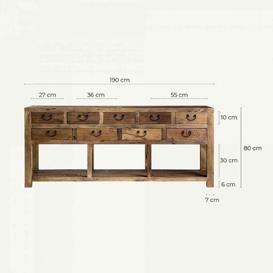 Esta consola de madera reciclada combina funcionalidad y estética rústica, con ocho cajones de distintos tamaños y tiradores metálicos envejecidos. Su acabado natural resalta la belleza de la madera recuperada, convirtiéndola en una pieza única ideal para entradas, salones o comedores.