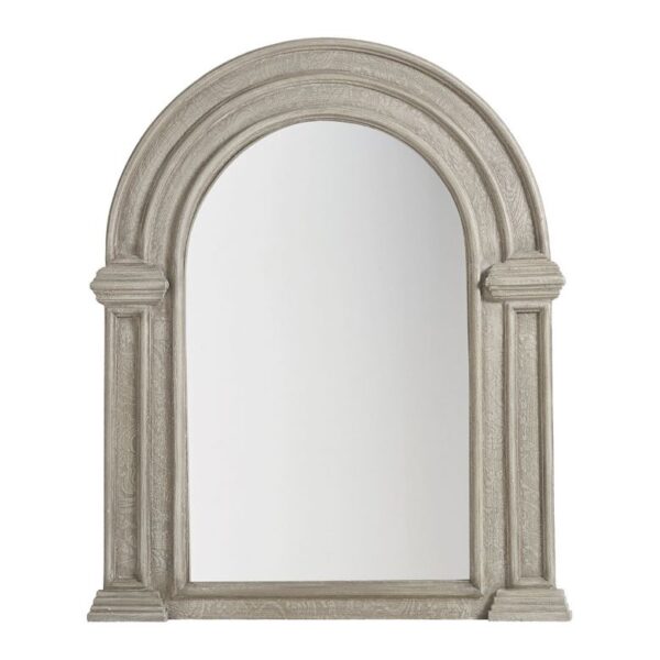 Este elegante espejo con forma de arco aporta una fuerte presencia visual y un aire de refinamiento arquitectónico. Su marco, meticulosamente tallado en madera con acabado gris envejecido, recuerda a los elementos estructurales de antiguas construcciones clásicas o renacentistas. Las columnas laterales esculpidas y los detalles curvos superiores acentúan su carácter decorativo y atemporal.