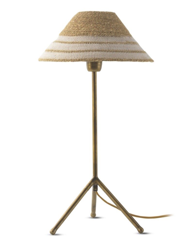 Con un diseño elegante y artesanal, esta lámpara de sobremesa destaca por su estructura metálica en acabado latón envejecido y su tulipa elaborada en fibra natural trenzada a mano. La pantalla, de forma cónica, presenta franjas tejidas en tono blanco que aportan un contraste visual atractivo y equilibrado. La base en forma de trípode añade un toque distintivo y estabilidad al conjunto. Su estética natural la convierte en una pieza versátil, perfecta para mesas auxiliares, escritorios o rincones de lectura. Además de funcional, su diseño aporta calidez y textura a cualquier espacio. Ideal para interiores que apuestan por materiales orgánicos y detalles hechos a mano.