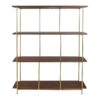 Librería de diseño elegante y ligero con estantes de madera de acabado nogal y estructura metálica dorada. Ideal para espacios contemporáneos que buscan funcionalidad con estilo.