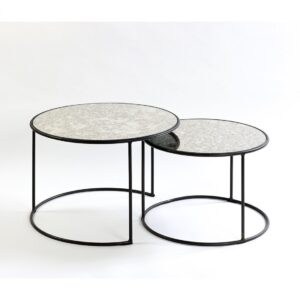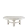 Mesa de centro baja fabricada en madera de olmo reciclado con acabado blanco envejecido. Su diseño redondo y su estructura sólida evocan una estética rústica refinada, perfecta para interiores cálidos y sofisticados.