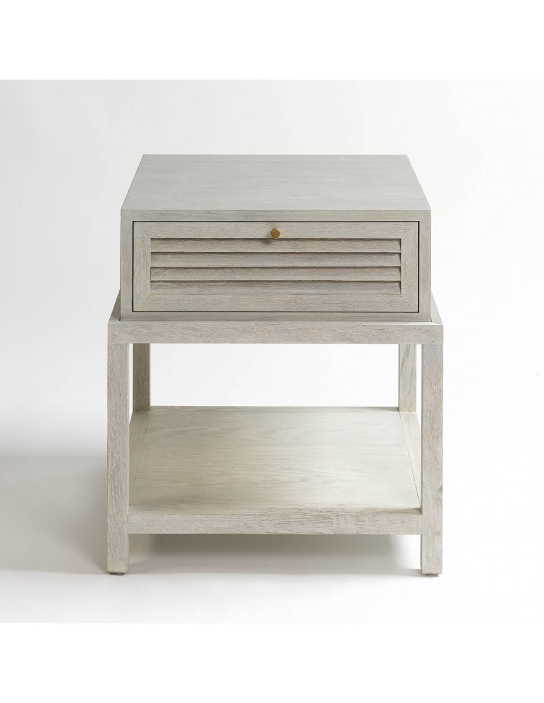 Esta mesita de noche es una pieza imprescindible para quienes buscan combinar funcionalidad y diseño en su dormitorio. Fabricada en madera de roble de alta calidad, destaca por su robustez y durabilidad. Su acabado blanco patinado aporta un toque de frescura y luminosidad que se adapta a diferentes estilos de decoración, desde lo contemporáneo hasta lo más clásico. El cajón superior cuenta con un atractivo diseño de lamas, ideal para guardar objetos personales, mientras que el estante inferior ofrece un espacio adicional perfecto para colocar libros, revistas o elementos decorativos. Sus líneas rectas y detalles cuidadosamente elaborados hacen de esta mesita de noche una elección elegante y práctica para complementar cualquier ambiente, añadiendo estilo y calidez al espacio.