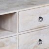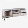 Este mueble de TV combina funcionalidad y diseño contemporáneo gracias a su construcción en madera natural y su sólida base metálica. Con cuatro cajones de diferentes tamaños, un compartimento abierto para dispositivos electrónicos y una puerta lateral, ofrece un amplio espacio para almacenamiento. Su acabado en tonos claros de madera aporta calidez y un estilo atemporal que se adapta a diferentes tipos de decoración. Las asas metálicas de diseño minimalista complementan su estructura, mientras que su base de hierro negro asegura estabilidad y durabilidad. Perfecto para quienes buscan un mueble práctico y estético para completar su espacio de entretenimiento.