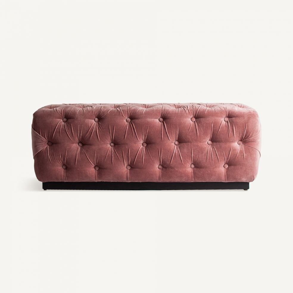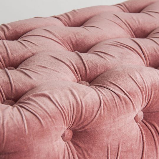 Este pie de cama, tapizado en un lujoso terciopelo rosa, destaca por su diseño capitoné con botones, creando un aspecto atemporal y sofisticado. Su estructura acolchada brinda comodidad y su estilo clásico encaja a la perfección en decoraciones elegantes o vintage. Ideal para colocar a los pies de la cama, este banco no solo proporciona un asiento adicional, sino también un elemento decorativo que realza la estética de cualquier dormitorio. Perfecto para quienes buscan combinar funcionalidad y estilo en su mobiliario.