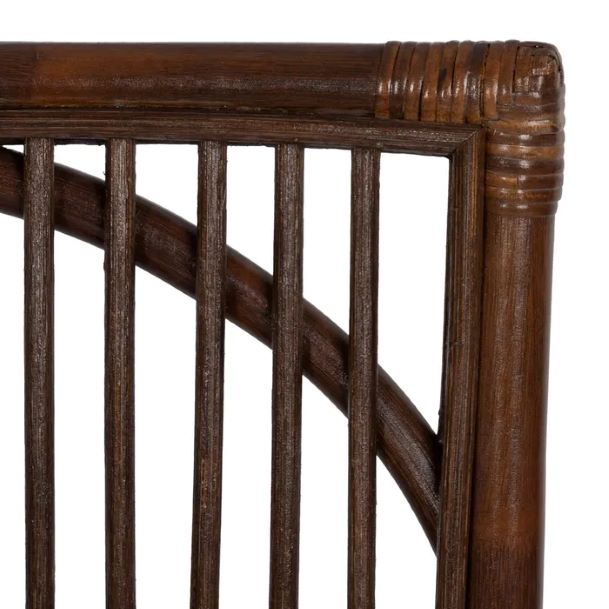 Con una silueta elegante y artesanal, esta silla de ratán con acabado en tono oscuro aporta un toque de distinción y calidez a cualquier ambiente. Su respaldo curvo con patrón de varillas verticales evoca un diseño clásico renovado, mientras que la base arqueada realza su estructura ligera pero robusta. El asiento se completa con un cojín blanco de líneas puras, ofreciendo comodidad sin sacrificar estilo.