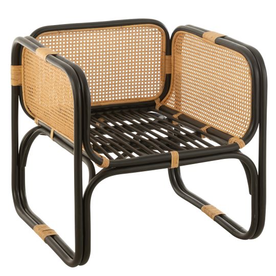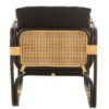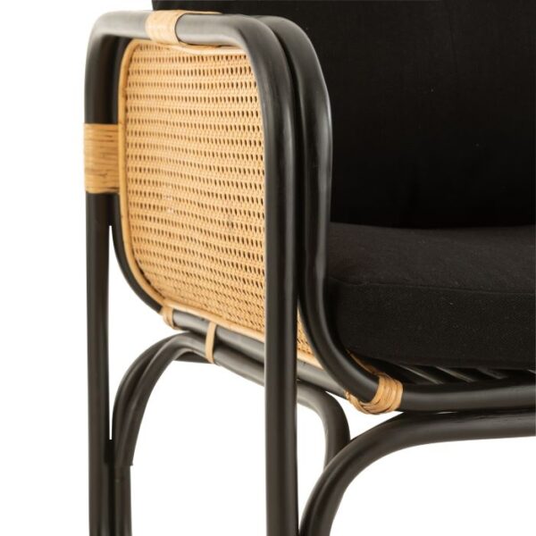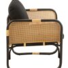 Sillón con estructura de bambú, rejilla de ratán natural y cojines negros, ideal para espacios modernos y acogedores.